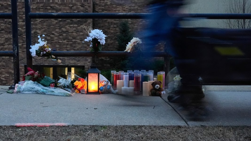A person walks by flowers and candles outside the Abundant Life Christian School on Dec. 17, 2024, in Madison, Wisconsin.
