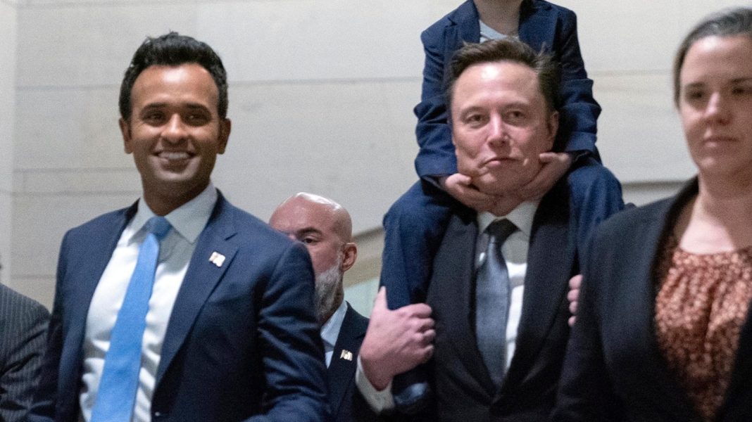 Vivek Ramaswamy and Elon Musk, who is carrying his son, arrive for a roundtable meeting to discuss President-elect Donald Trump’s planned Department of Government Efficiency, on Capitol Hill in Washington, Dec. 5, 2024.