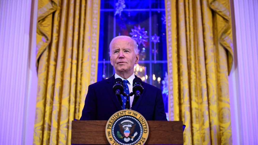 President Biden speaks during a reception in the East Room of the White House on Dec. 16.