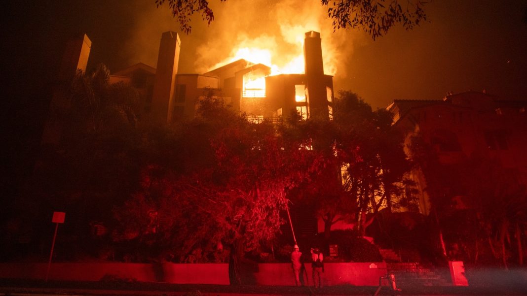 LOS ANGELES, CALIFORNIA – JANUARY 9: Flames from the Palisades Fire burn a residential building on Sunset Boulevard amid a powerful windstorm on January 9, 2025 in the Pacific Palisades neighborhood of Los Angeles, California. Multiple wildfires fueled by intense Santa Ana Winds are burning across Los Angeles County. At least five people have been killed, and over 25,000 acres have burned. Over 2,000 structures have also burned and almost 180,000 people are under orders to evacuate. (Photo by Apu Gomes/Getty Images) ***BESTPIX***