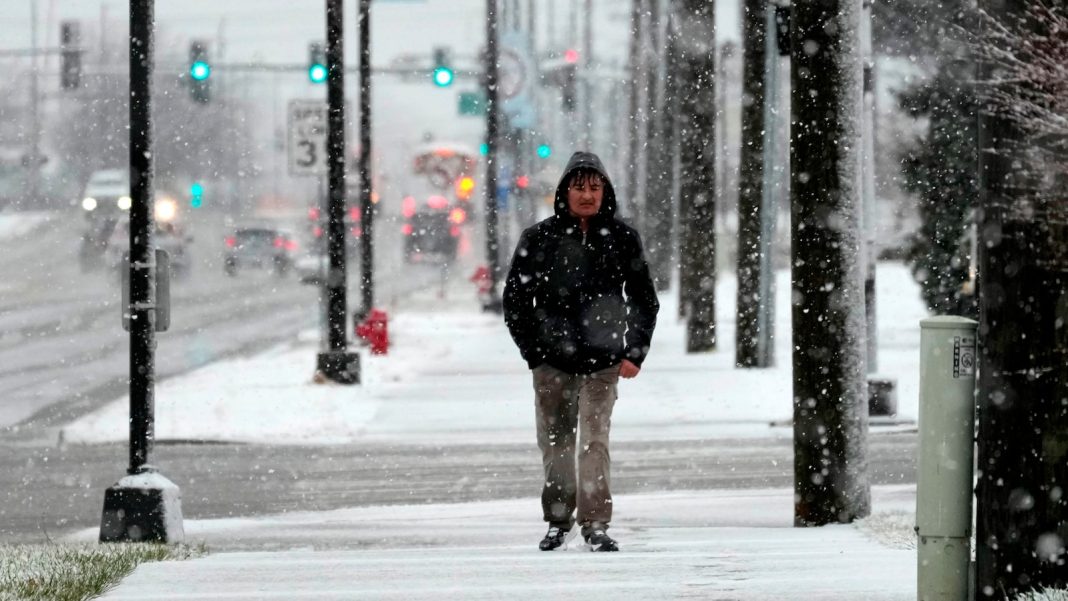 Pedestrian walks on a snow-covered sidewalk in Wheeling, Ill., Jan. 9, 2024.