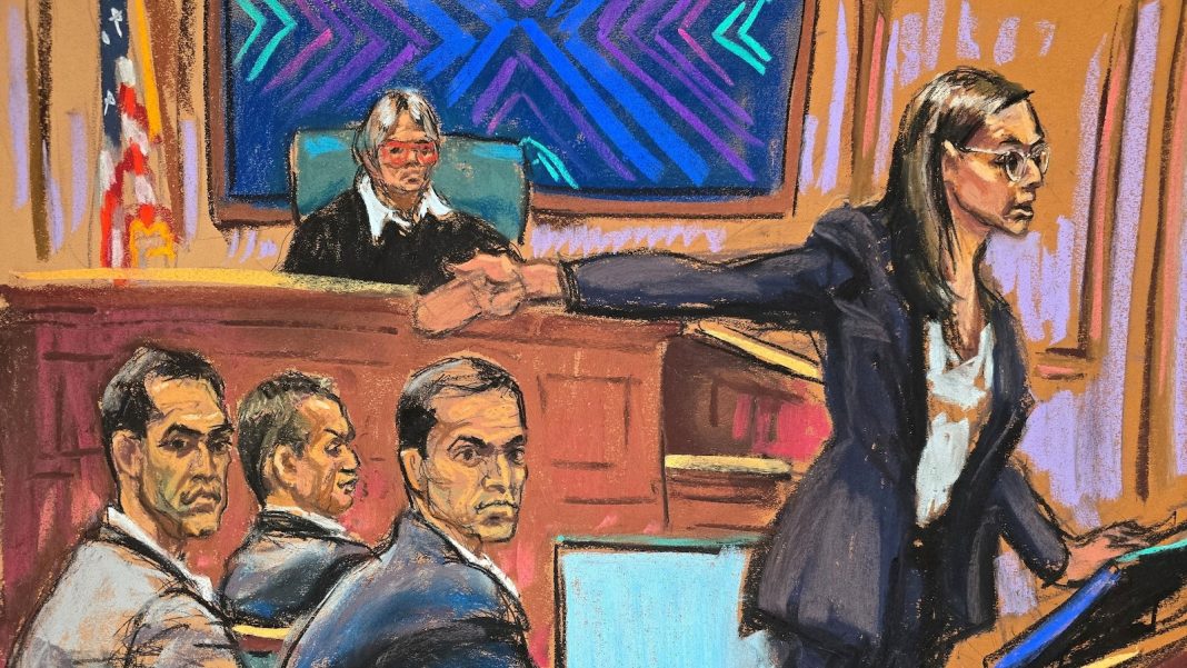 Prosecutor Madison Smyser points towards high-profile real estate agent brothers Tal Alexander, Alon Alexander and Oren Alexander, sitting before Judge Valerie E. Caproni, during her opening statement at the start of their federal sex trafficking trial in New York, Jan. 27, 2026, in a courtroom sketch.