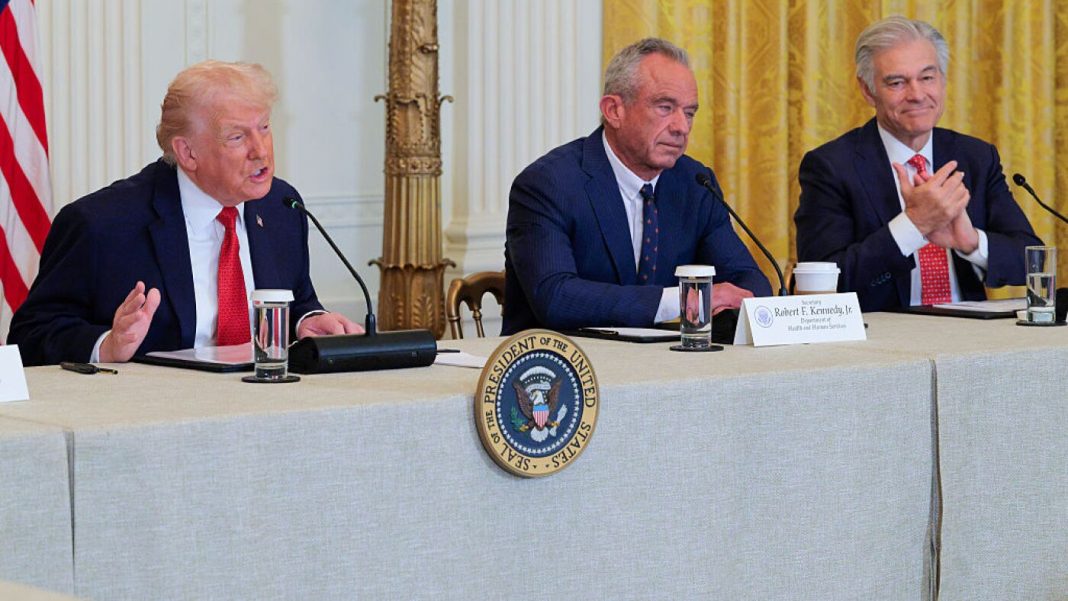 U.S. President Donald Trump speaks as U.S. Secretary of Health and Human Services Robert F. Kennedy Jr. and Administrator for the Centers for Medicare & Medicaid Services Mehmet Oz look on during a rural health roundtable on January 16, 2026 in Washington, DC.