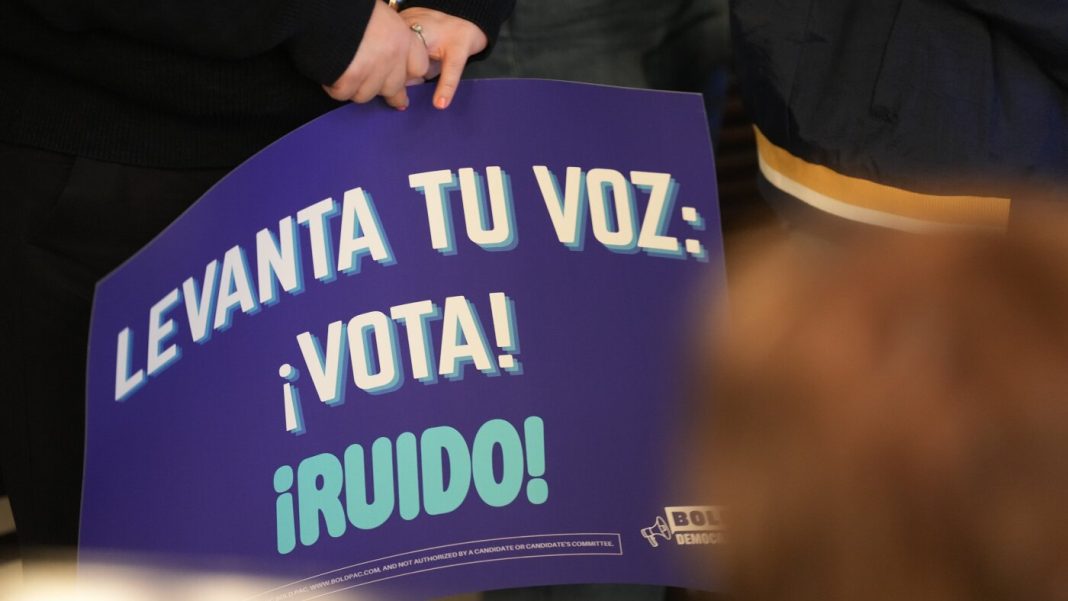A person holds a sign saying “Raise your voice: Vote” at a creator event for BOLD Democrats, a Hispanic PAC, in Houston on Feb. 17. Democrats think they may have a chance to sway Latino voters who supported President Trump two years ago.