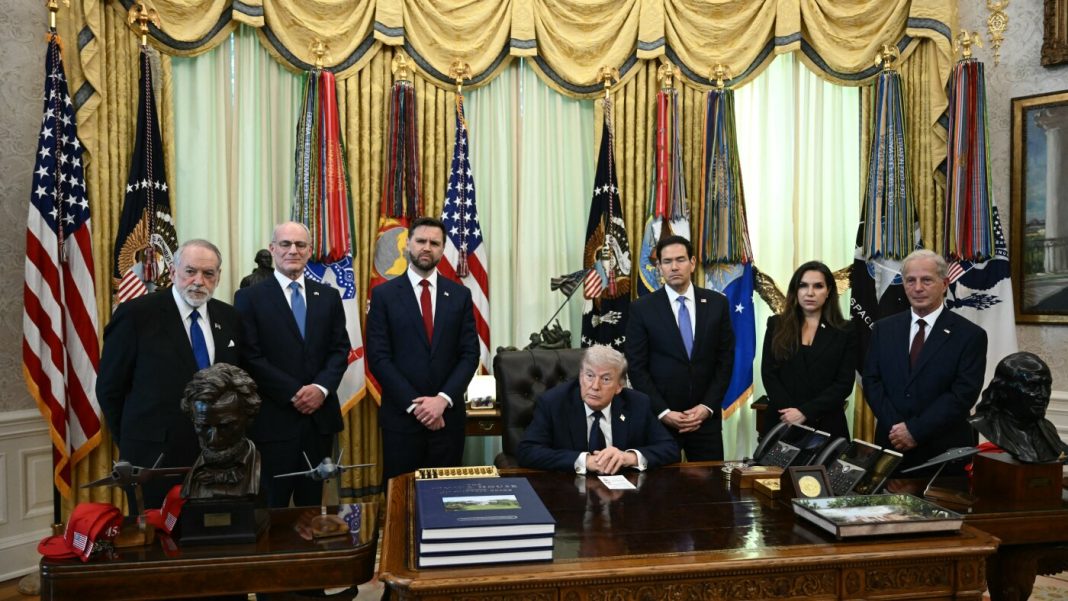 From left: U.S. Ambassador to Israel Mike Huckabee, Israeli Ambassador to the U.S. Yechiel Leiter, Vice President Vance, President Trump, Secretary of State Marco Rubio, Lebanese Ambassador to the U.S. Nada Hamadeh Moawad and U.S. Ambassador to Lebanon Michel Issa listen to questions from the media at the White House in Washington, D.C., on Thursday.